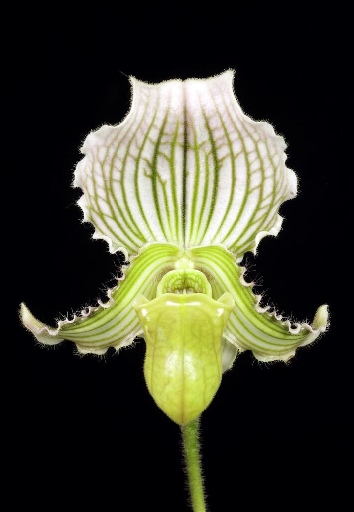 Paphiopedilum fairrieanum f. bohlmannianum (album) ‘Tavel,’ AM/AOS 81, exhibited by Dave Sorokowsky, photo by Ramon de los Santos.