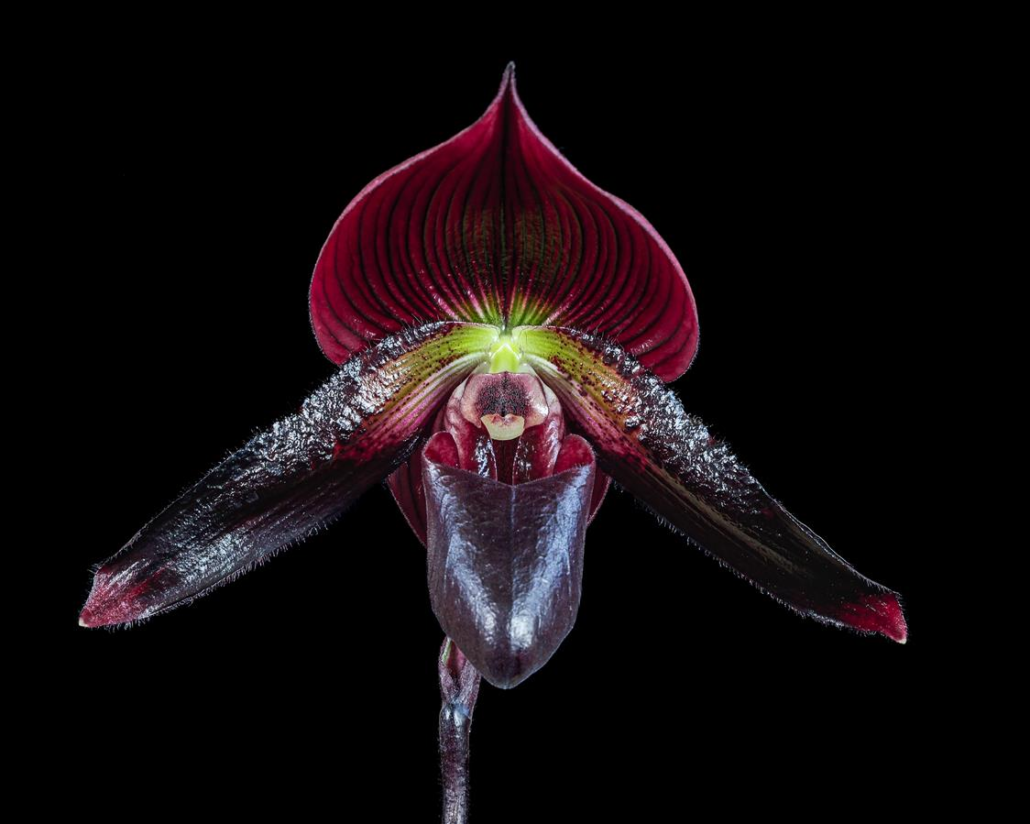 One intensely dark flower on one erect, 20-cm inflorescence; sepals ovate, beet purple, veined darker purple; petals oblong, hirsute at margins, down swept, almost black, bright green basally; pouch dark burgundy; staminode horseshoe-shaped, mauve, dark purple centrally; substance firm; texture glossy; plant 26.0 wide by 32.0 cm tall.