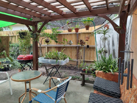 At the conclusion of the meeting, we took a brief tour of my outdoor growing area, which has a shaded pergola and adjacent shelving covered by 55% shade cloth for the Cattleyas. Note my misting system, which takes advantage of a small hole in the hose as well as the nozzle set on “mist.” I activate it each afternoon to cool down the scorching temperatures.